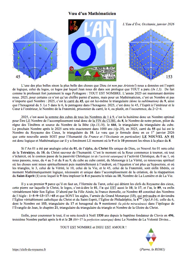 Dans la 6ème République, on n'est pas français avec ses pieds, on n'est pas français par son sang, on est Français avec son cœur et avec son esprit qui SONT le CŒUR et l'ESPRIT du CHRIST, Fils de l'Homme (*). C'est donc à chaque Française et à chaque Français de connaître et de mettre en œuvre son propre ARTICLE 3, dans la sainte Dualité Christique, par et pour le Christ, pour et avec les autres, pour Marie, notre REYNE, et pour notre ROY Rémi que nous conduirons inéluctablement, avec l'aide et dans la crainte de Dieu, à la Victoire finale sur les forces sataniques qui régissent notre monde. (*) Il faut bien sûr au préalable sauver son âme et pour cela renaître d'Eau et d'Esprit (par la Pierre puis le Rô), et ensuite boire Son sang (le Saint-Esprit), et manger Son corps (le 10, en faisant tourner sa roue, les 4 éléments, dans le bon sens), de façon à être toujours dans le Christ et l'avoir toujours en soi.